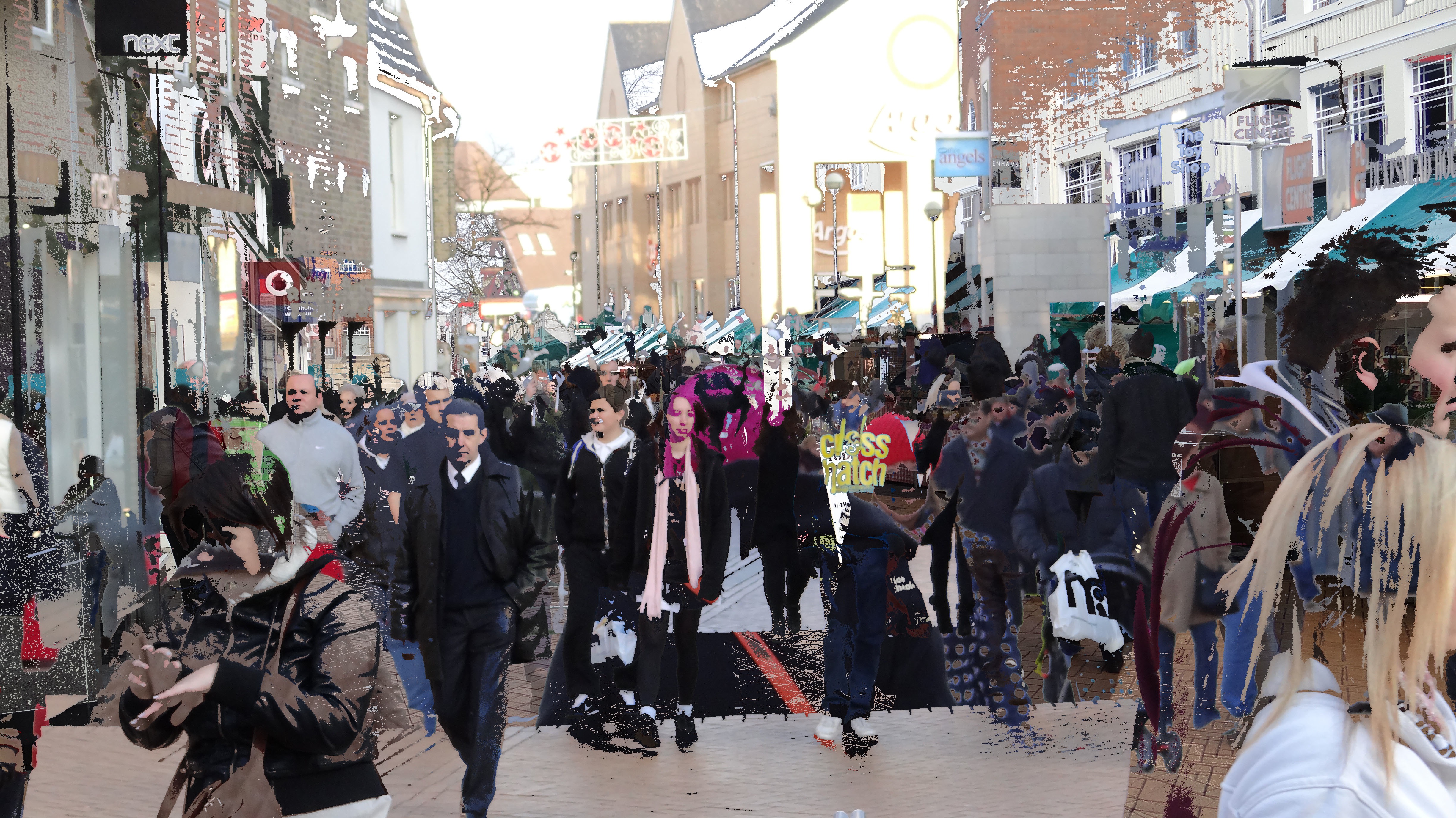 I visited Chelmsford on two occasions and photographed people going about their business shopping, walking to work, queuing or tending to children. There were people chatting and socialising from all generations. I realised that what brings a city to life is the people and this is what I wanted to show in my series of work. I visited the site of the gallery and decided it allowed for art with some detail, as it will be seen by people walking along the path next to it, it is not really visible from the road.