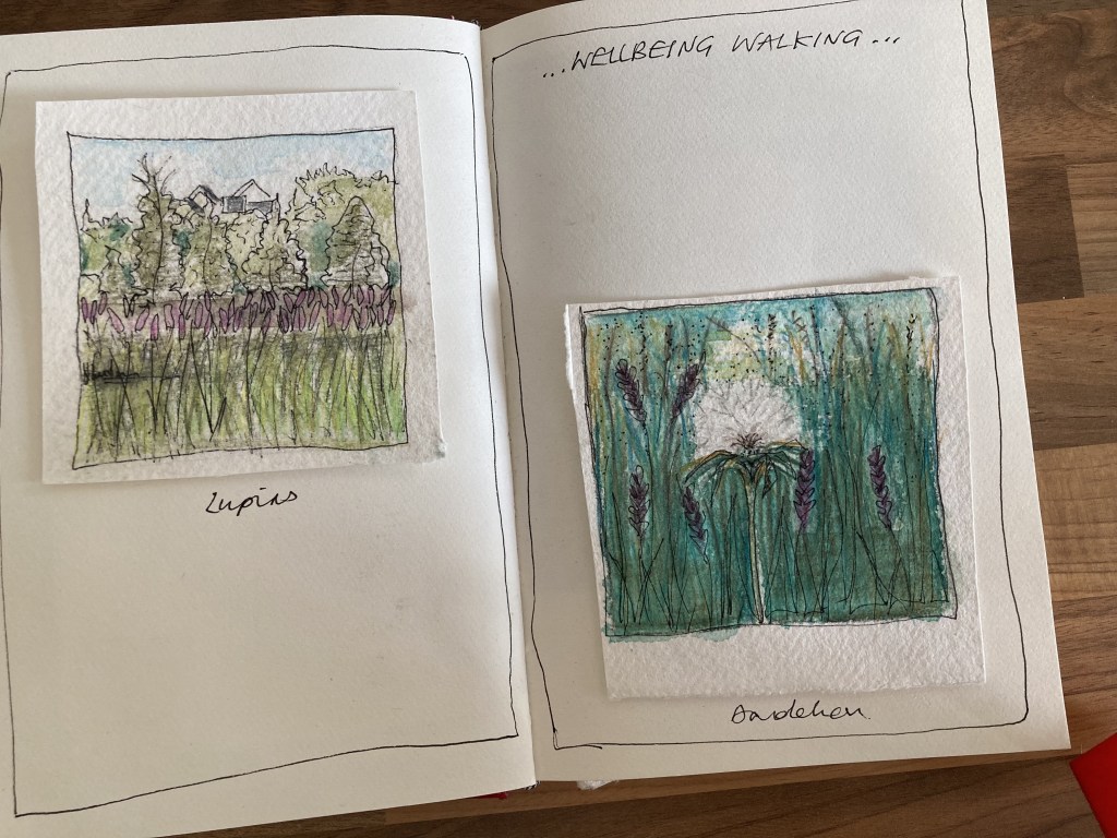 I have started an art journal so I can keep in one place all the art I am making in the name of looking after my own physical and mental wellbeing. I walk a lot and I don’t know about you but my phone is full of photographs of interesting things I noticed my walks such as a bindweed that I didn’t know could be pink and white striped, or a dandelion that looks different to yesterday’s dandelion that you also took a picture of. I have also been making art while preparing for and teaching art for wellbeing and have botanical drawings and Zentangle inspired pieces. As I have produced these works, I have placed them in my sketchbook along with flowers that are pressing nicely in the back pages. By keeping the pieces together in a sketchbook, naturally, a journal develops.