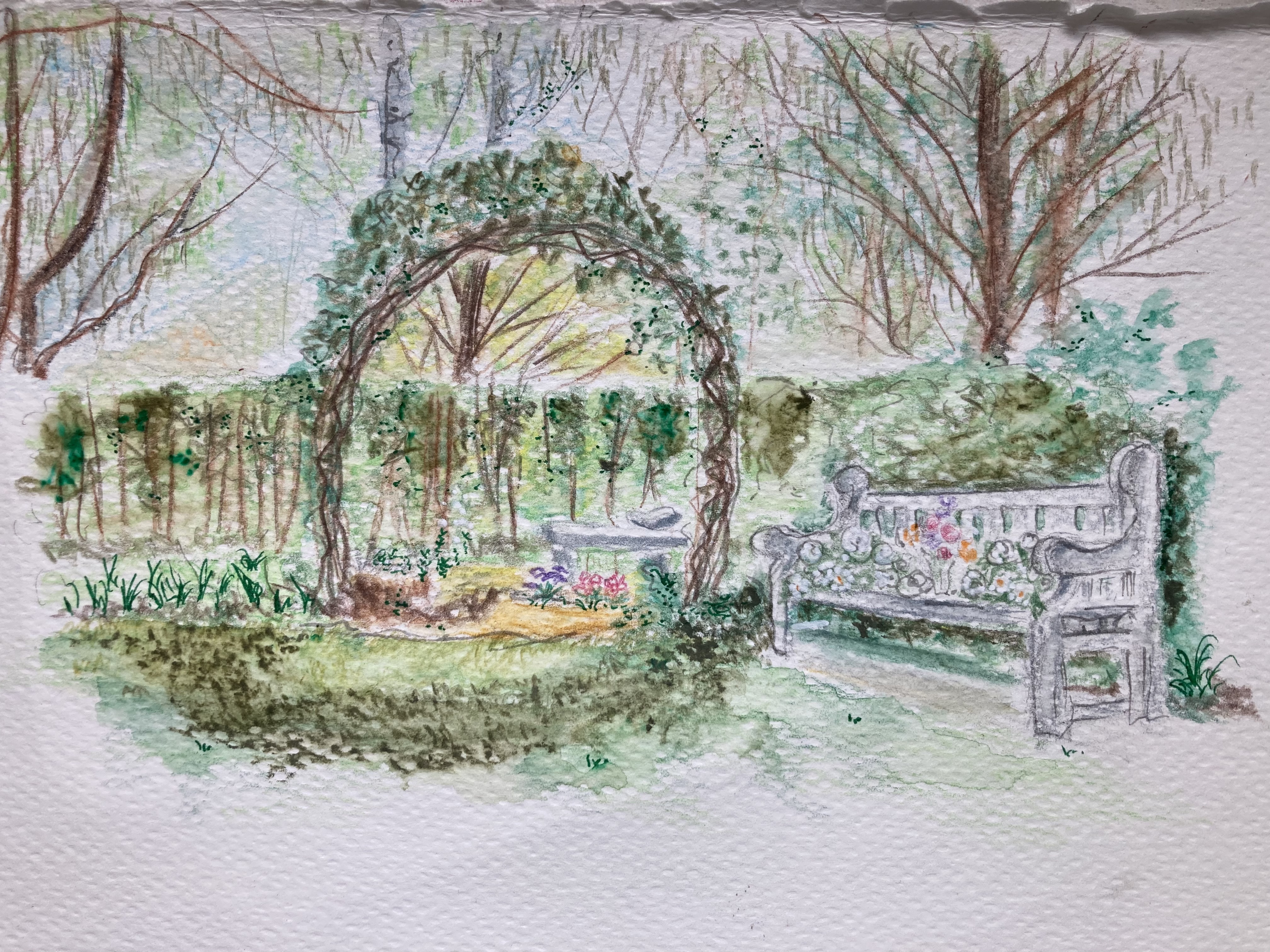 Last week was filled with sad news of the passing of friends and family of friends. I chose a corner of the memorial garden on campus to create a watercolour painting. I’m unsure if that is the name of the garden. It has become a place where tributes are left in memory of those that have passed in recent years. It is also a retreat for peaceful sitting. As I studied the leaves, flowers and man made structures; I reflected, just sat and thought. I layered my painting with the subtle changes in green tone. My aim was to give it the depth and richness I wanted to achieve. I pondered (now there’s a word I don’t use often enough) on how and when we turn to nature. We use plant materials to celebrate life, whether that life is in the current, recently or long since passed. Flowers are given, wreaths or bouquets are laid or trees are planted in memorial. We become connected to nature by these acts of tenderness throughout our lives; we become memories planted firmly in those places of solace when we have moved on. This little corner of the campus is truly a wonderful place for addressing life balance and mental reset. Capturing the current through text and poetry can develop or strengthen mindful practice. It lets us close all the open tabs and hit the power down button for a short while.