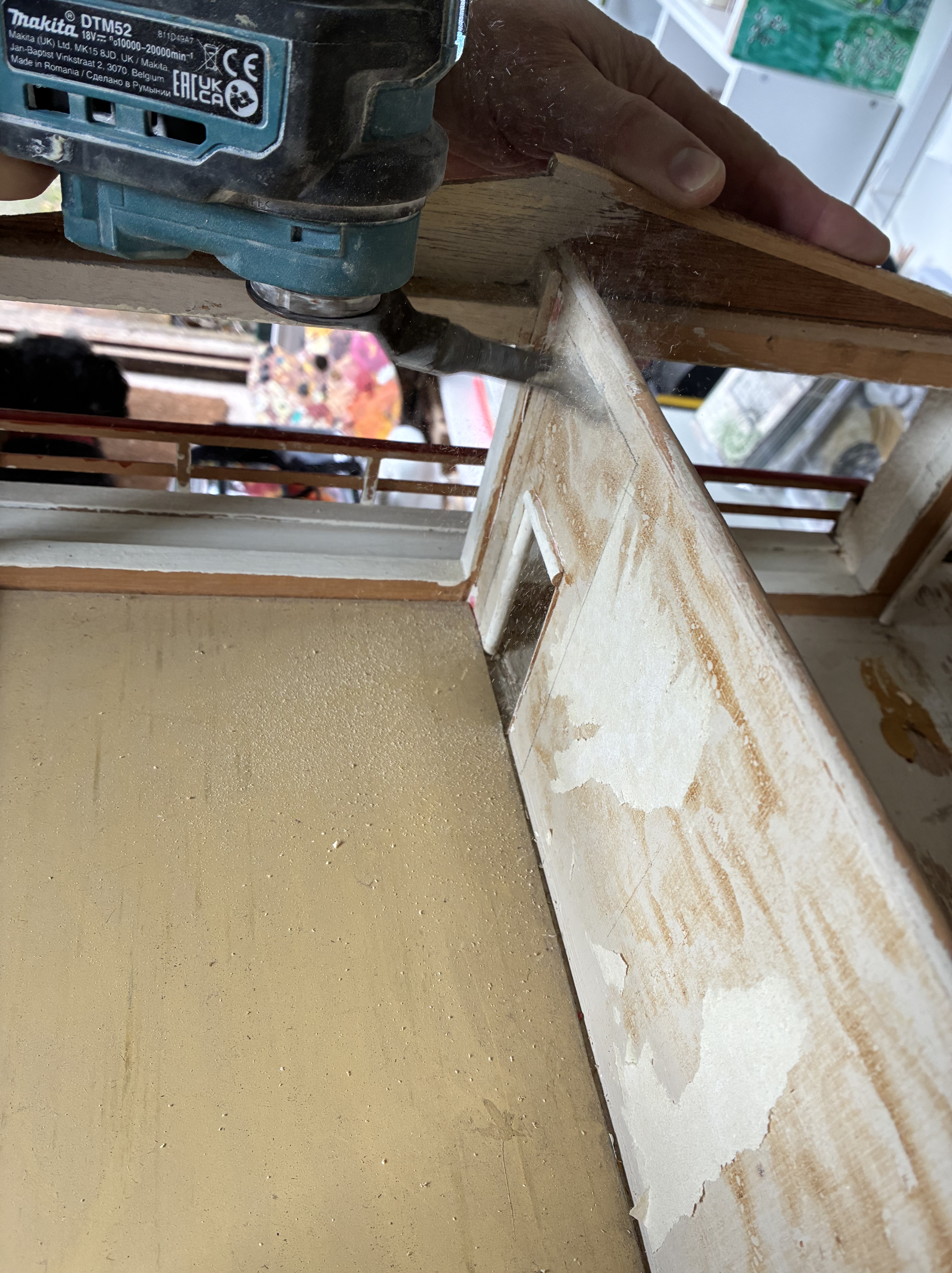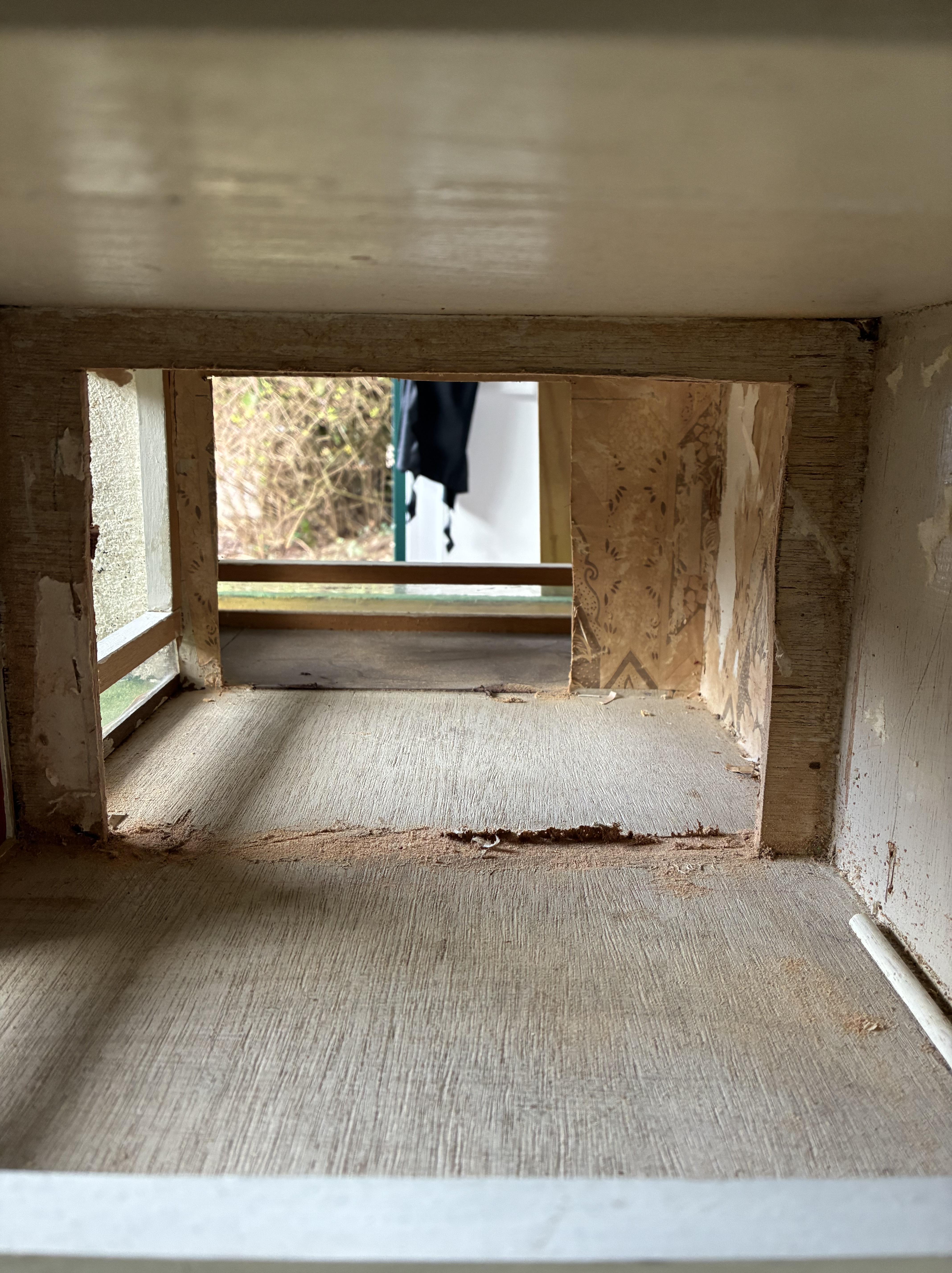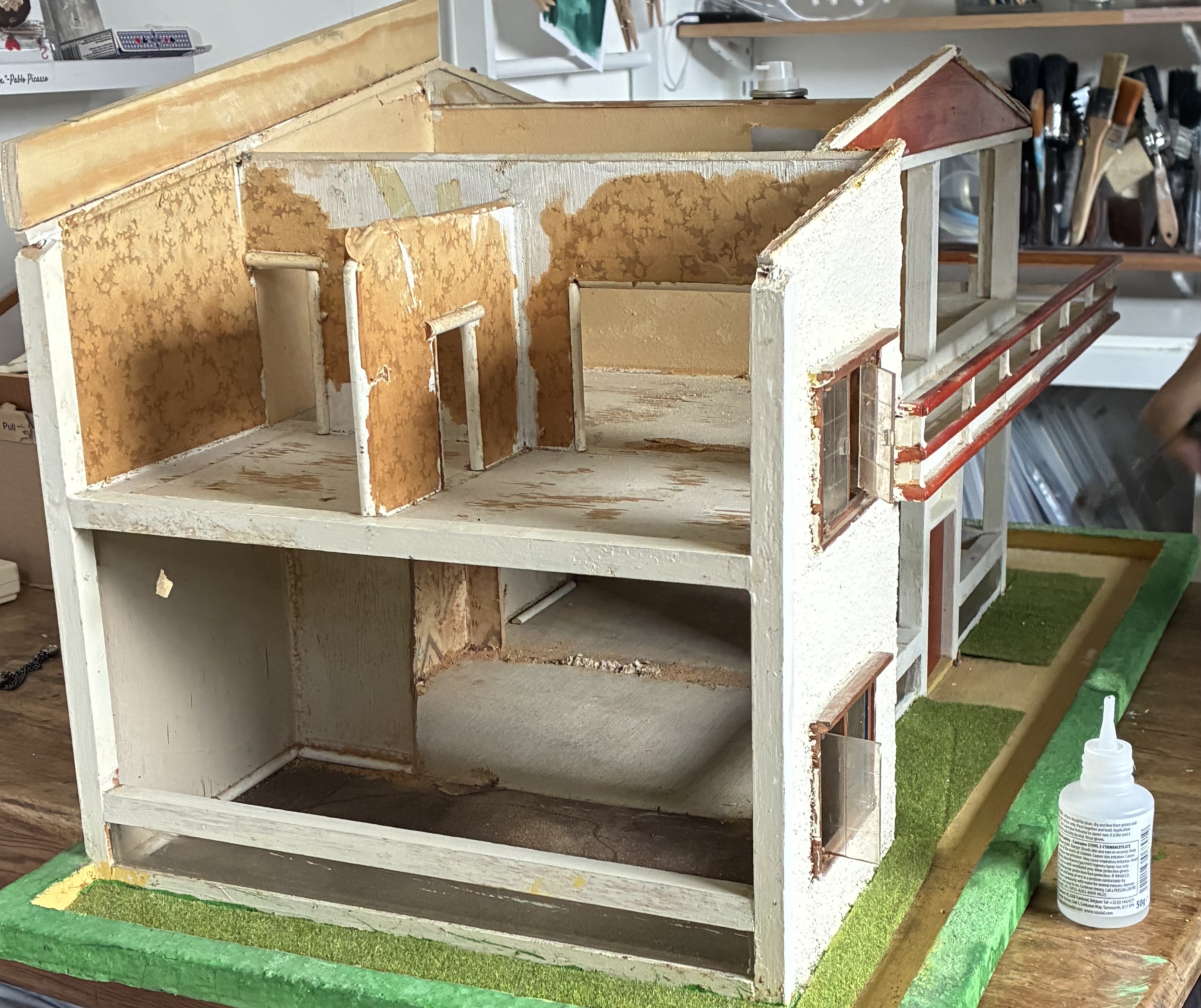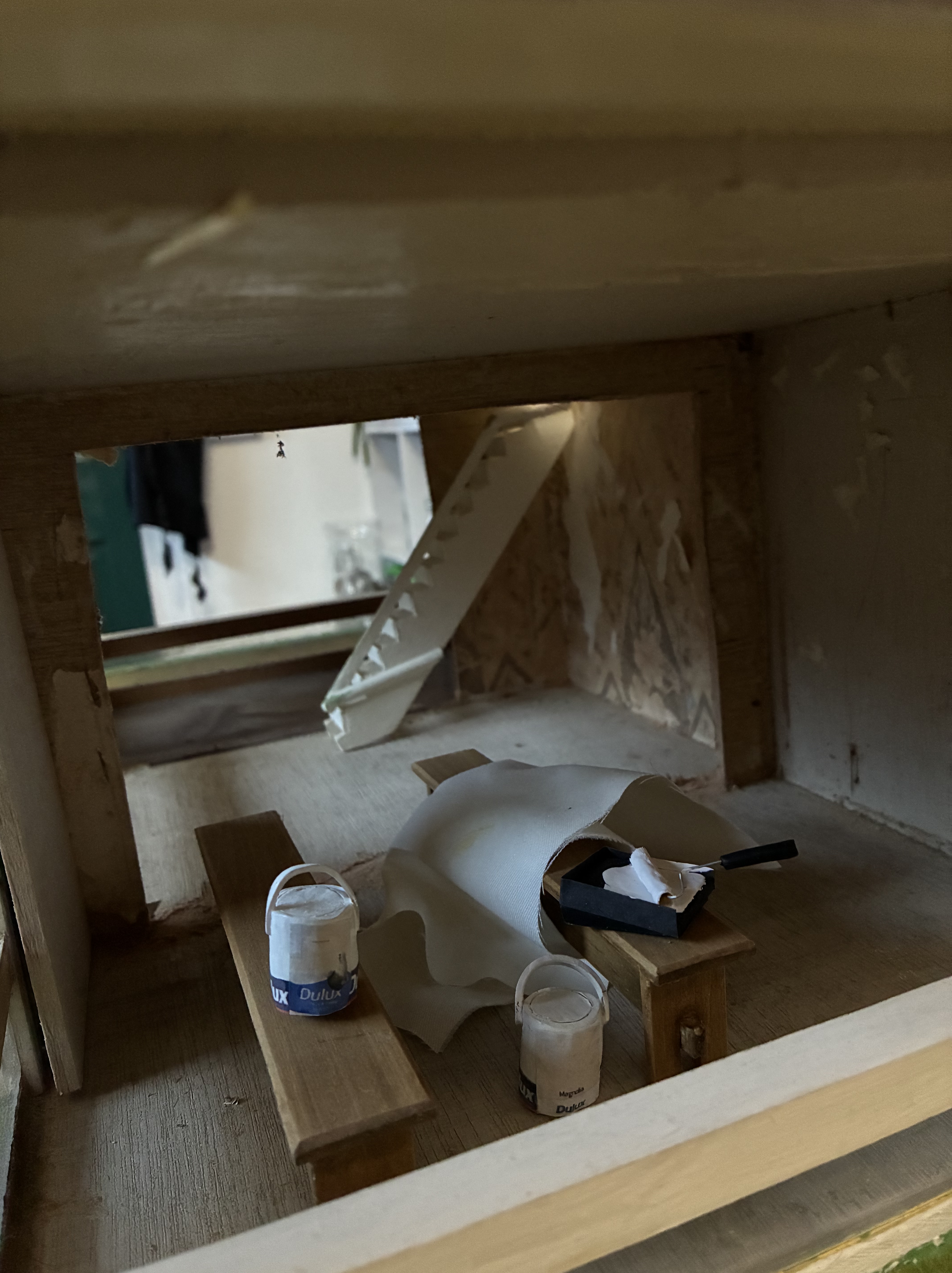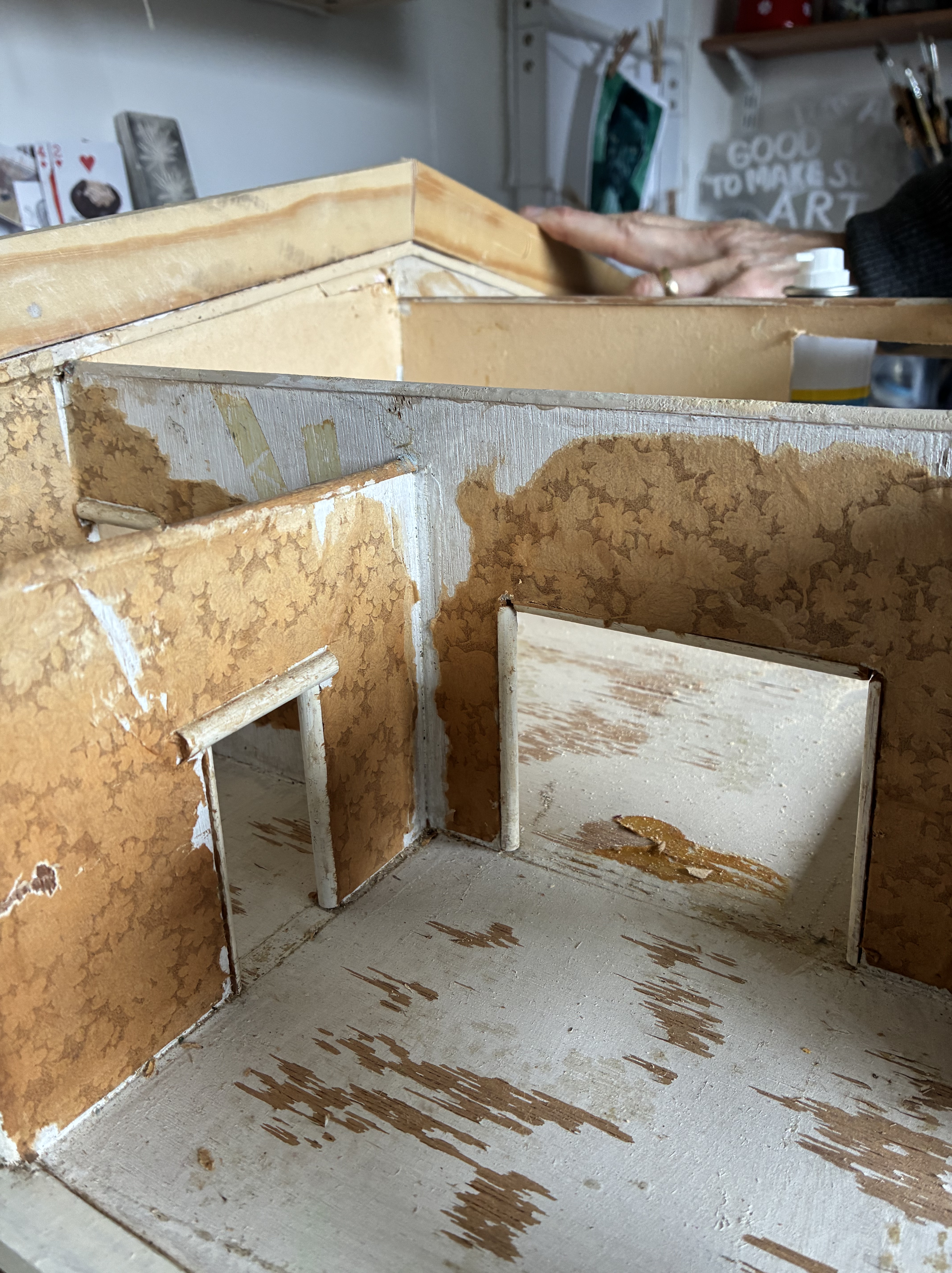 The roof came off in two pieces, but that was to be expected. Removing it revealed a whole new world of possibilities inside. Once it was off, I started to wonder how I could raise the roof. My Gaga had made a pitched roof to make the house more special, which adds character and charm, so I wanted to retain that essence; yet, I also needed the ceilings upstairs to be higher to look more authentic. I want this miniature arts centre to be as close to 12th scale as possible, and it will be, as long as my inhabitants are no taller than the average height!