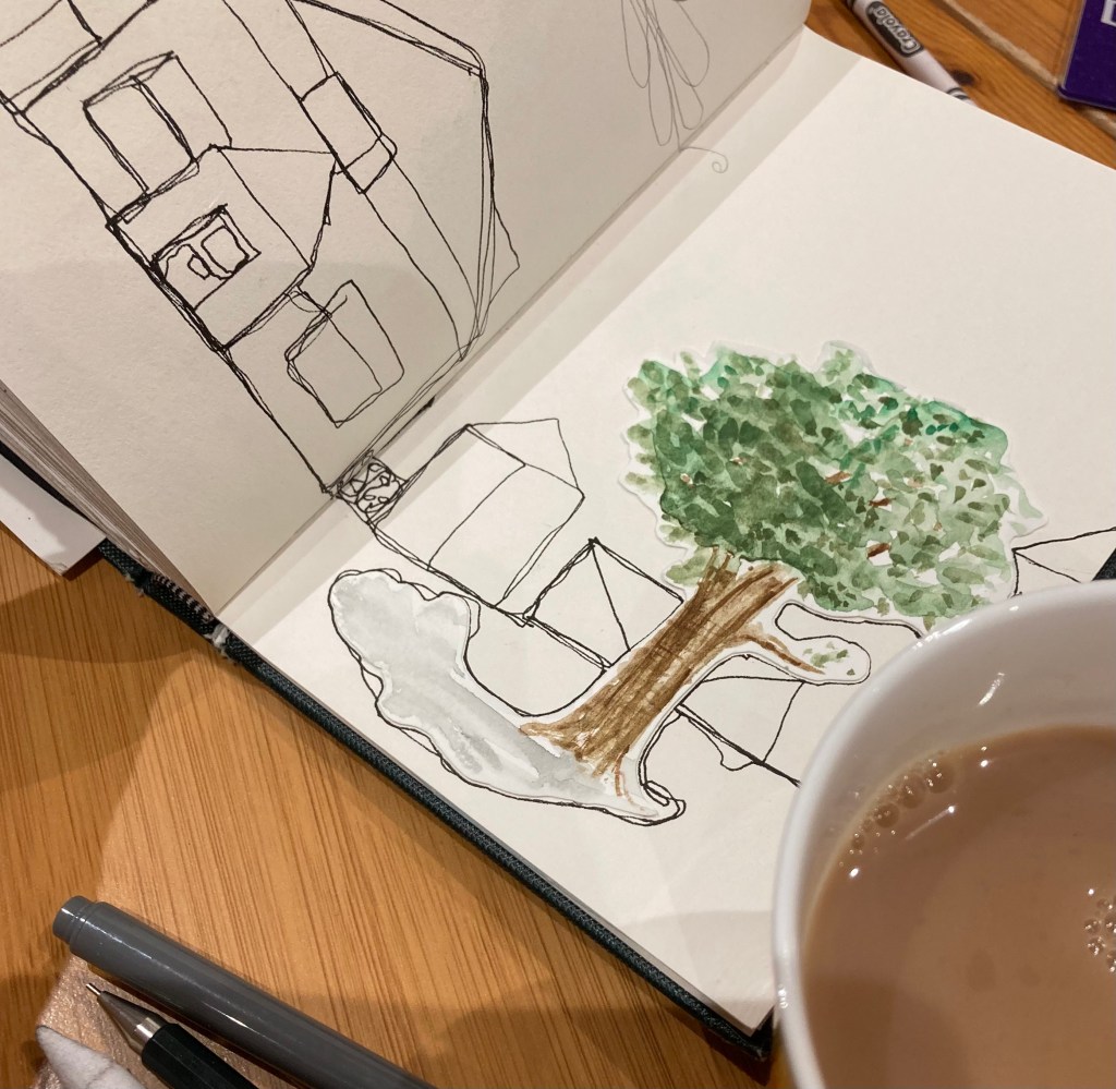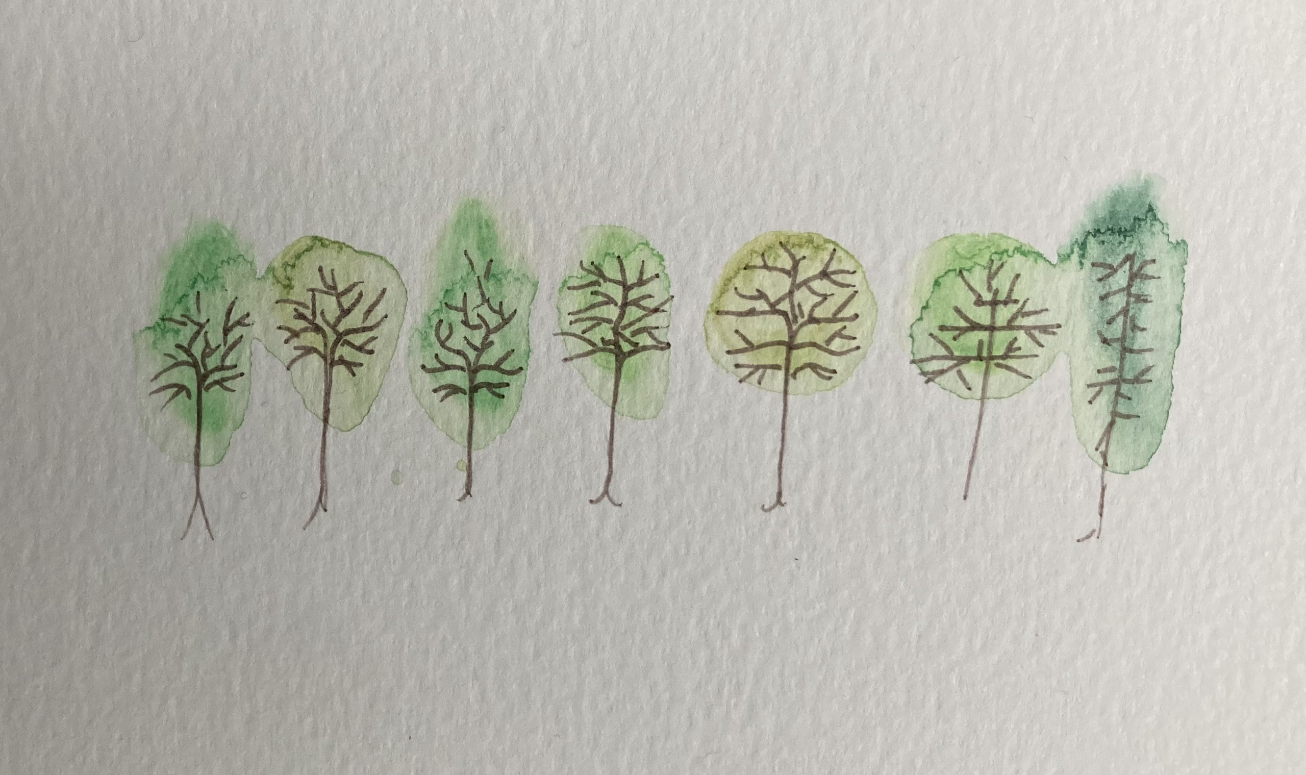 I have many versions of drawing a tree. The one above is the first from today. I have another class tonight, so I will do at least one more. The tree is one I pass at least once a day. It often has a gang of dog walkers gathered underneath, chatting and socialising their dogs. Whatever the weather, they throw sticks in the river for games of ‘Fetch’. This is lovely to see. I manoeuvre my way around excitable pups who sometimes jump up to say hello. This prompts many apologies all round for a variety of reasons. Of course, all are totally unnecessary. But hey-that’s what we English do right?